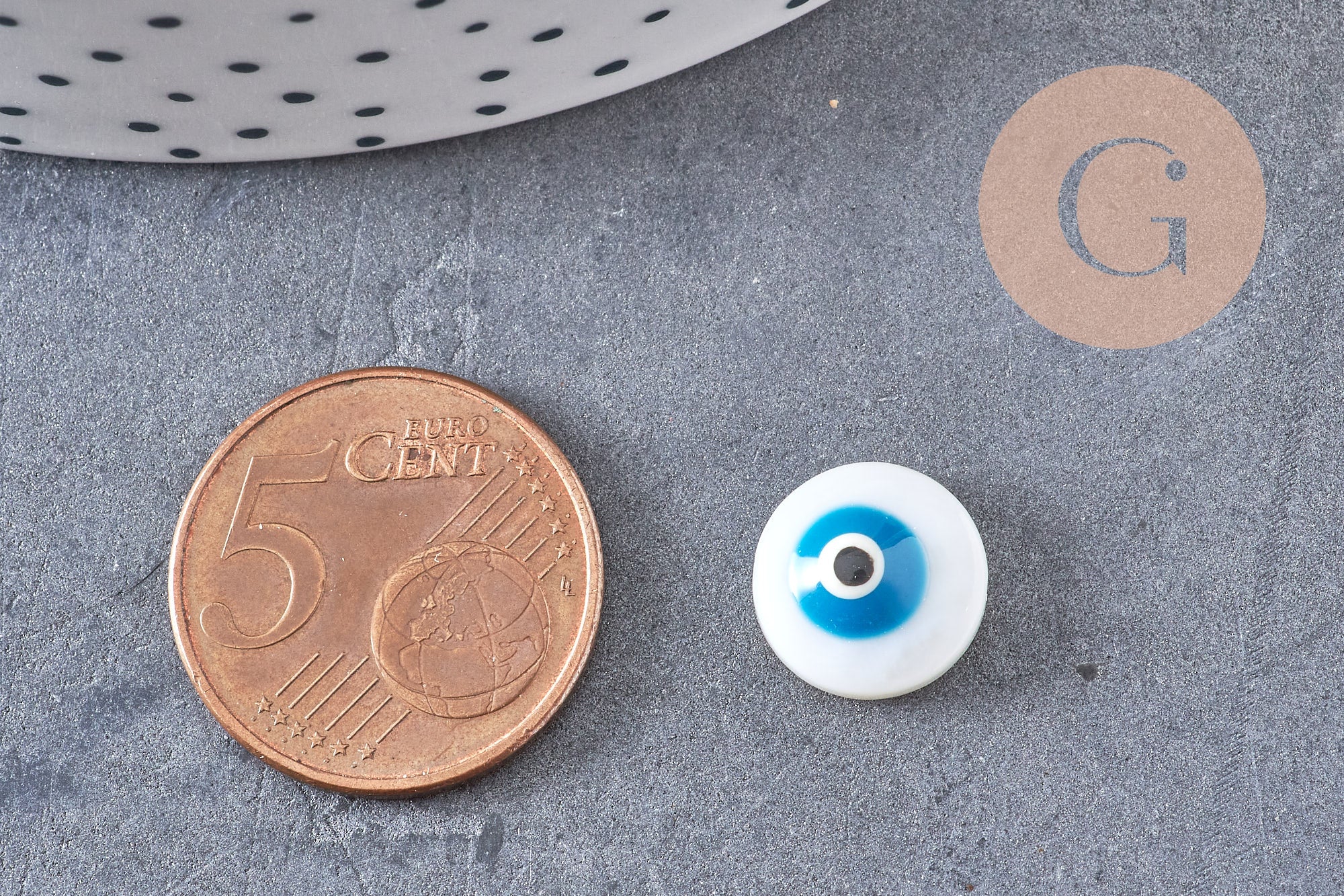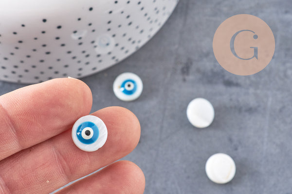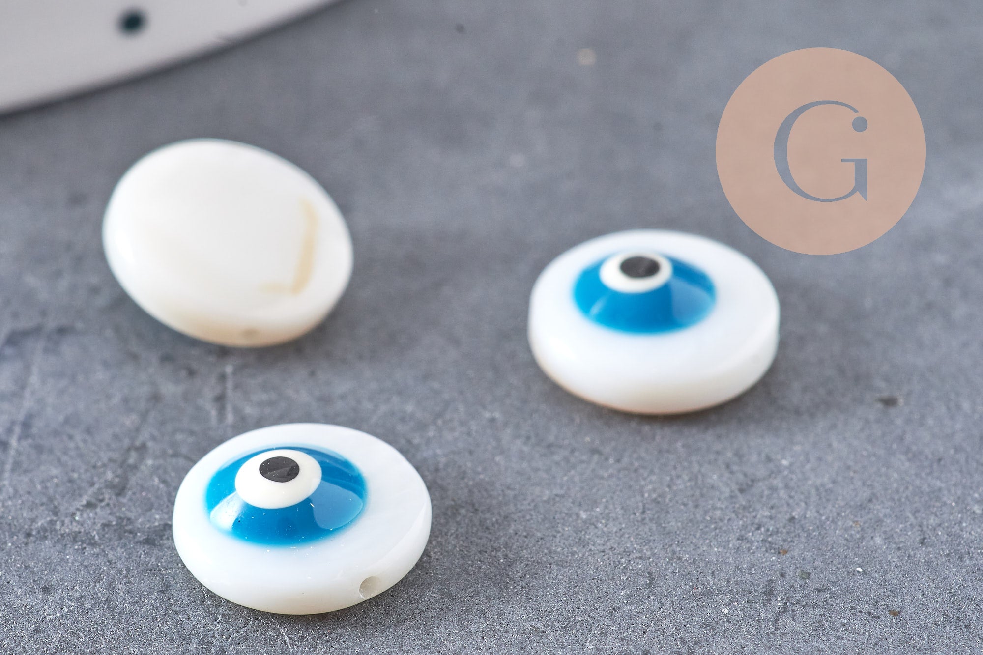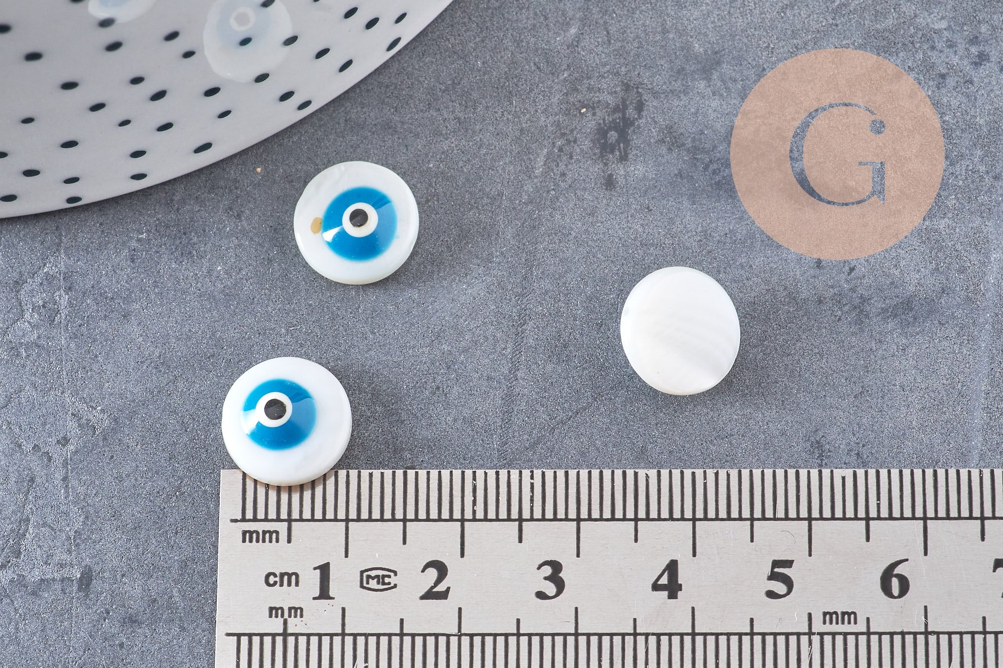 Craquez pour ce lot de 10 perles rondes en nacre blanche représentant l'oeil de la chance,Pour customiser vos bijoux, et autres accessoires en textile ou cuir souple,