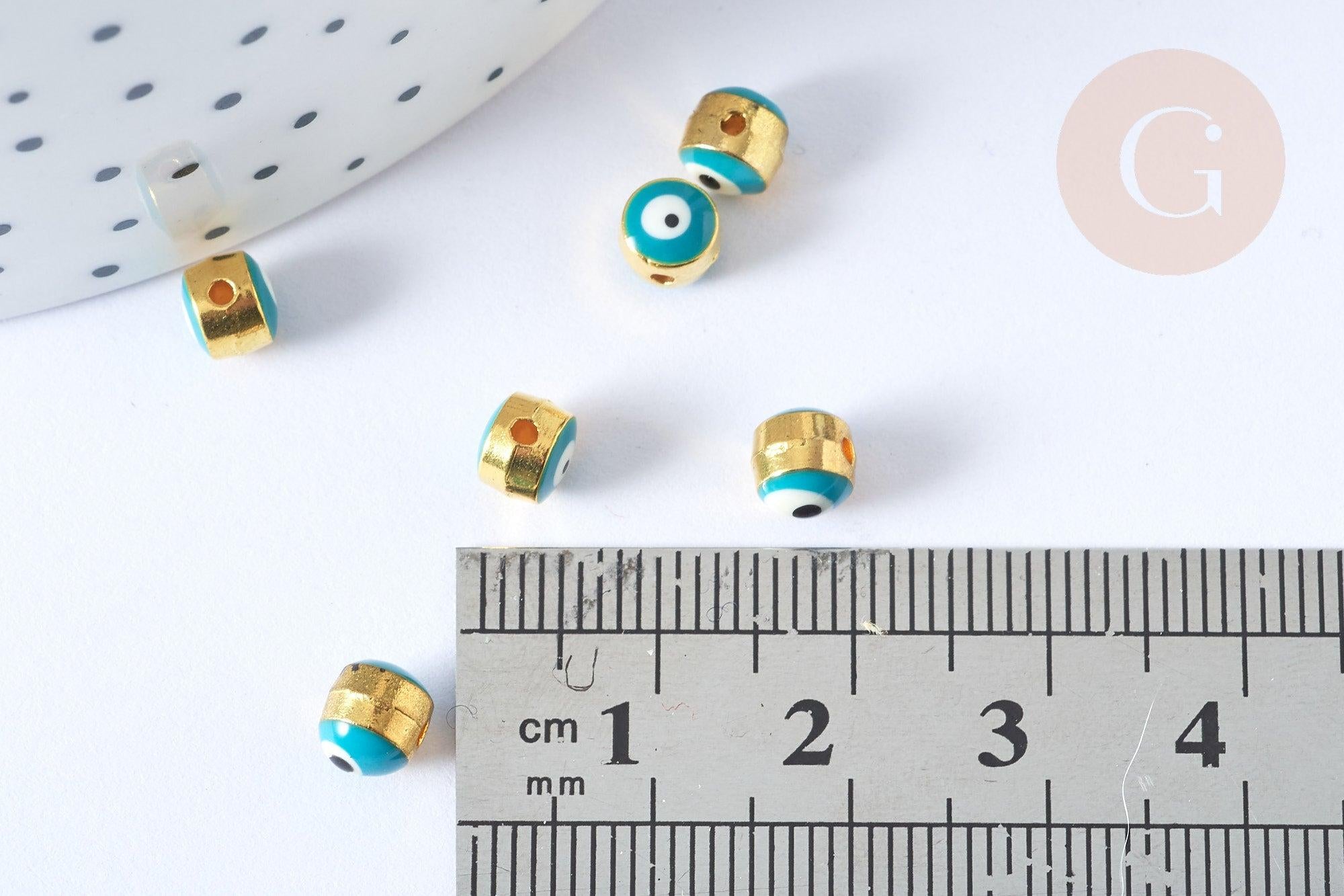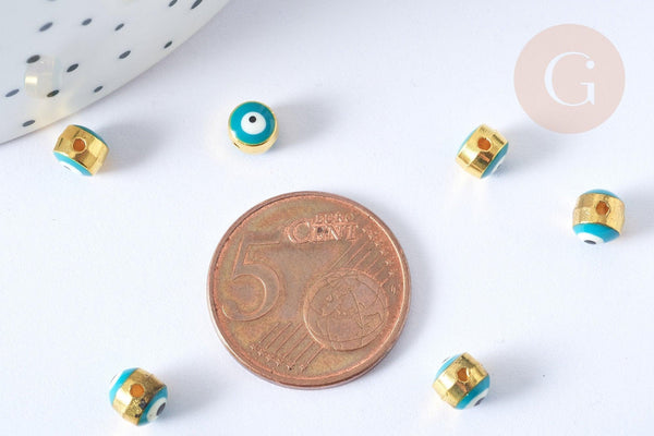 Perle en zamac doré, émaillée en turquoise, ayant pour motif "le mauvais œil".