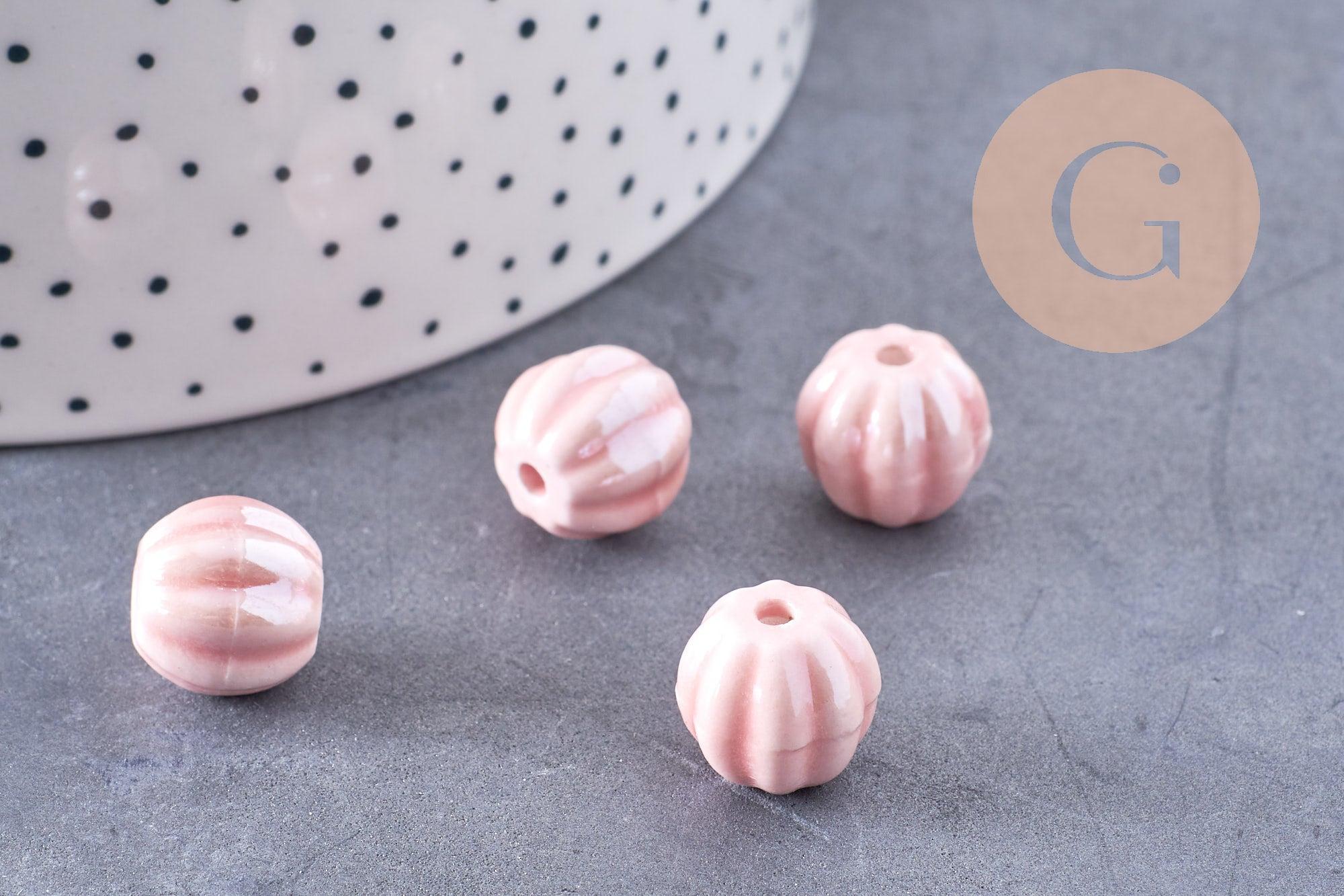 Ces perles en porcelaine rose irisée, de 13 mm, présentent un design strié élégant qui leur confère un aspect raffiné et lumineux.