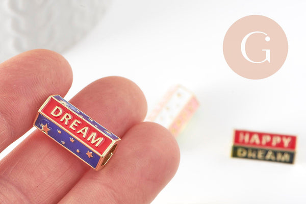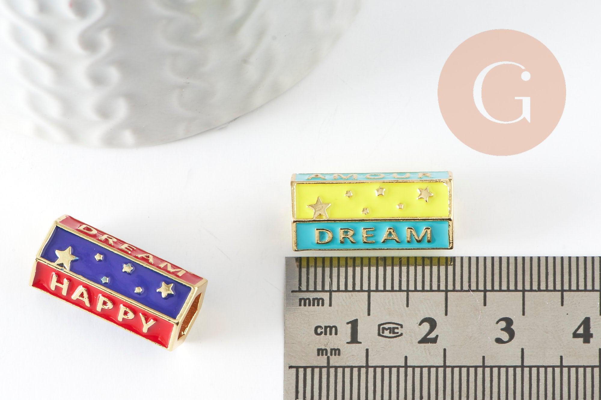 Perle tube talisman message "happy" "dream" émail coloré laiton doré 21,5 mm, perle dorée à message , x1 G8027