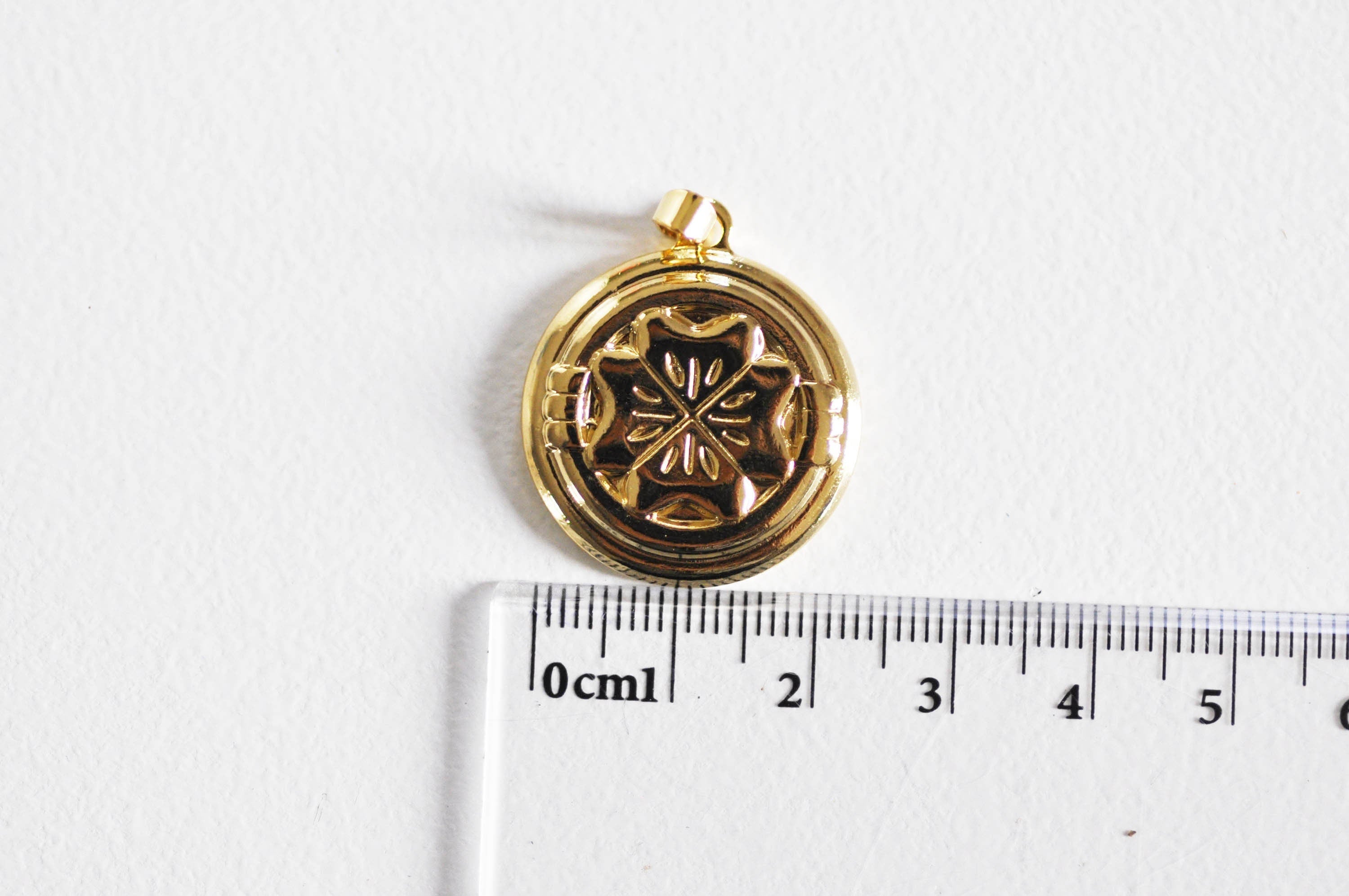Pendentif médaille ronde trèfle acier doré,fournitures créatives, pendentif doré,sans nickel,laiton doré, création bijoux,médaille or,2.7cm Une jolie médaille dorée représentant un trèfle à quatre feuilles. Dimensions : Longueur : 27mm Largeur : 23.5mm Epaisseur : 3.5mm Anneau: 7x4mm. Garantis sans nickel,...