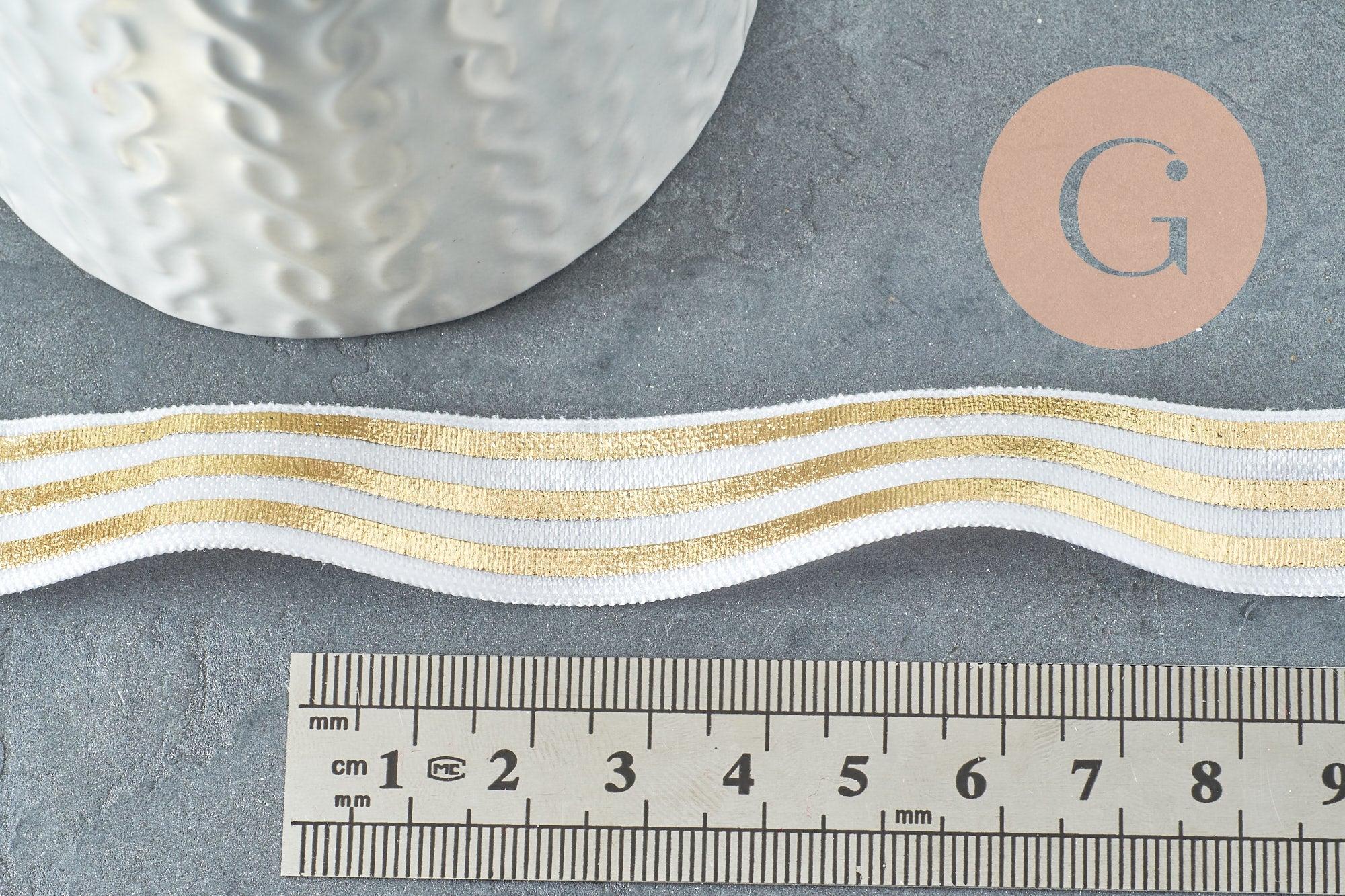 Vous allez aimer ce ruban élastique large avec son motif doré sur fond blanc.