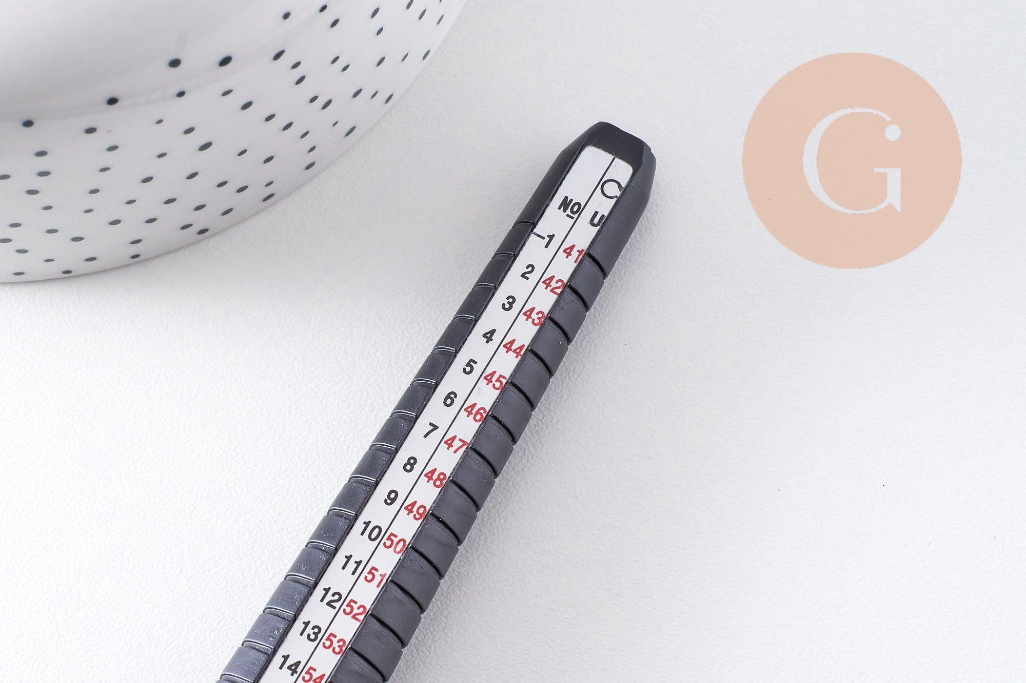 Grâce à son marquage double (tailles britanniques et américaines) ou quadruple ( tailles américaines, européennes, japonaises et HK ), il est parfait pour mesurer ou vérifier le diamètre intérieur de vos bagues.
